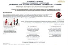 «О взаимоотношениях в коллективе» приурочено к Всемирному дню психического здоровья и посвящено профилактике травли. Школьников научат выстраивать отношения в классе, объяснят, в чем отличие конфликта от травли, и дадут советы по эффективному и позитивному общению. 09.10.2023