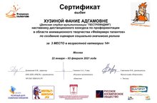 Всероссийский дистанционный конкурс по профессиональной профориентации в области анимационного творчества «ФЕЙЕРВЕРК ТАЛАНТОВ» по созданию сценария социально-значимого ролика прошел 22 января – 03 февраля 2021 года в городе Москва