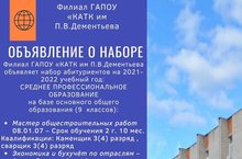 ‼️ВНИМАНИЕ!Филиал ГАПОУ «КАТК им П.В.Дементьева объявляет набор абитуриентов на 2021-2022 учебный год:СРЕДНЕЕ ПРОФЕССИОНАЛЬНОЕ ОБРАЗОВАНИЕна базе основного общего образования (9 классов):✅Мастер общестроительных работ 08.01.07 – Срок обучения 2 г. 10 месКвалификации: Каменщик 3(4) разряд , сварщик 3(4) разряд✅Экономика и бухучёт по отраслям – Срок обучения 2 г. 10 месКвалификации: Бухгалтер✅Мастер сельскохозяйственного производства 35.01.11– Срок обучения 3 г. 10 месКвалификации: Оператор животноводческого комплекса и механизированных ферм – 4 разряда, слесарь по ремонту с/х машин – 3 разряд, тракторист-машинист с/х производства ВСDEF, водитель автомобиля категории С???? Форма обучения – очная.Язык обучения – русский????Обучение проводится на бюджетной основе.Успевающим студентам выплачивается стипендия.✉️Наш адрес: 422780,Республика Татарстан, Пестречинский район, село Ленино-Кокушкино,ул. Техническая, д.10????Телефон: 8(843)67-340-11, 89178600712Факс: 8(843)67-340-11Электронная почта: ProfL93@yandex.ru -