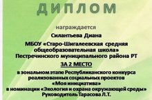 Силантьева Диана - обучающаяся 10 класса заняла 2 место в зональном этапе Респкубликанского конкурса реализованных социальных проектов "Моя инициатива" в номинации "Экология и охрана окружающей среды". Руководитель Тарасова Ляйсан Тимерхузеевна