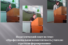 6 января прошло очередное заседание педагогического совета по теме: "Профессиональная компетентность учителя: стратегии формирования"План педсоветаВыступления:Романова Н.И. "Развитие и саморазвитие профессиональной компетентности учителя"Трофимова Н.Н. "Профессиональная компетентность учителя"Долгова Л.П. "Профессиональная компетентность учителя в условиях ИКТ"Антипова Н.М. "ИКТ технологии в педагогической компетенции учителя"Итоги первого полугодияМамасадыкова Э.А.- директор школыИванова Л.В.- зам директора по УВРХаритонова М.А.- зам директора по ВР -