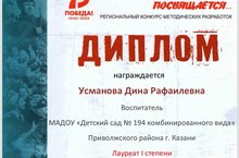 Коллектив детского сада поздравляет воспитателя Усманову Дину Рафаилевну с призовым местом, лауреат 1 степени в региональном конкурсе методических разработок, посвященный 75 летию Победы в Великой Отечественной войне. И желает творческих успехов!