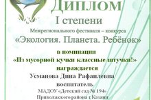 Коллектив детского сада поздравляет педагогов нашего детксого сада: Искакову Насиху Ибрагимовну, Усманову Дину Рафаилевну и Угарину Галину Степановну с Дипломом 1 степени Межрегионального фестиваля - конкурса "Экология. Планета. Ребенок" в номинации "Из мусорной кучки классные штучки!" в рамках Международной программы "Экошколы - "Зеленый флаг"