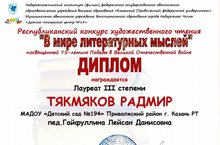 Поздравляем Тякмякова Радмира, руководитель: Гайфуллина Ляйсан Данисовна с призовым местом! Лауреат 3 степени в республиканском конкурсе художественного чтения "В мире литературных мыслей". Коллектив детского сада желает творческих успехов!