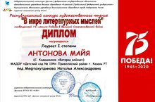 Поздравляем воспитанницу нашего детского сада Антонову Майю, руководитель воспитатель Мефтахутдинова Н.А. с почетным местом, лауреат 1 степени в республиканском конкурсе художественного чтения "В мире литературных мыслей"