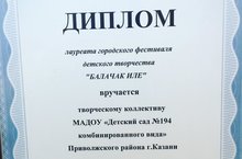 Творческий коллектив детского сада № 194 был награжден Дипломом лауреата городского фестиваля детского творчества "Балачак иле", от всей души поздравляем и желаем коллективу творческих идей и побед!!!!