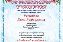 Наш педагог Усманова Д.Р. приняла участие во Всероссийском конкурсе идей по оформлению помещений "Любимый праздник! и была награждена Свидетельством.