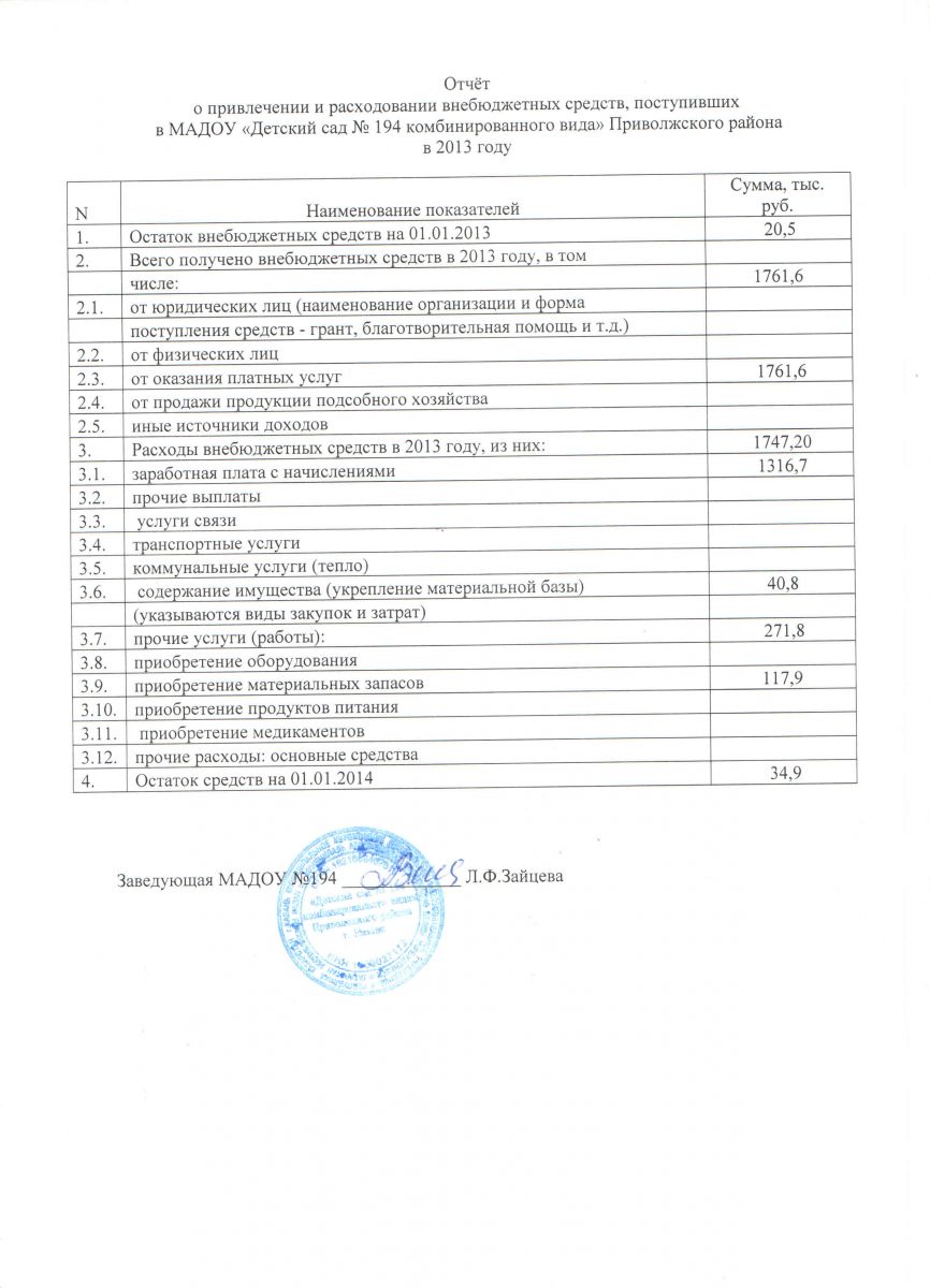 Отчет о привлечении и расходовании внебюджетных средств за 2013