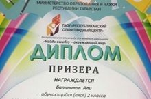 Ученик 2 В класса Батталов Али (учитель Егорова Рамиля Рифатовна) стал призёром Республиканской олимпиады для младших школьников " Найди ошибку - окружающий мир" по предмету окружающий мир . Поздравляем!!! Желаем достижения ещё лучших успехов !!!