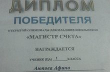 Поздравляем ученицу 1"В" класса Аюпову Афину(учитель Сабирова Г.М.) с победой в открытой олимпиаде для младших школьников "Магистр счёта" проводимой МБУДО "Городской центр творческого развития и гуманитарного образования для одарённых " г.Казани. Желаем ей достижения ещё больших побед.