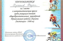 Казан шәһәре идел Буе районы гомуми белем бирү учреждениелары укучылары арасында үткәрелгән "Егетләр җиңел атлетика кроссы"нда 1нче урын яулаган 11нче сыйныф укучысы Хусаенов Фазылны кайнар котлыйбыз !!! (җитәкчесе Максимова Е.И.)