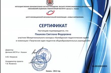 Учитель русского языка и литературы МБОУ "Гимназия №18" С.Ф.Пашкова награждена СЕРТИФИКАТОМ Центра инновационной образовательной информации "Новые направления" за участие в Межрегиональном конкурсе "Калейдоскоп педагогическихх идей" в номинации "Творческие идеи педагогов общеобразовательных учреждений"