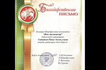 Эльмира Шәрифуллина исемендәге “Яшь талантлар” бәйгесендә катнашып, иҗади уңышларга ирешкән өчен Садыйков Равил Хәсәншович рәхмәт хаты белән бүләкләнде!!! КОТЛЫЙБЫЗ!!!