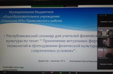 18 декабря на базе МБОУ " Гимназия №6" состоялся республиканский онлайн-семинар для преподавателей физической культуры.Через платформу ZOOM были показаны фрагменты уроков и внеурочных мероприятий учителей физической культуры гимназии №6. Участники онлайн-конференции, учителя, представители ГАОУ ДПО ИРО РТ высоко оценили организацию семинара.