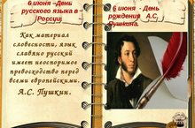 6 июня в день рождения А. С. Пушкина отмечается День русского языка — российский и международный государственный праздник, посвящённый русскому языку.Состоится торжественное мероприятие у памятника А.С.Пушкина возле Татарского государственного академического театра оперы и балета имени М.Джалиля,в котором участие Президента Республики Татарстан Р.Н.Минниханова.