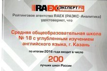 По итогам рейтинга, сформированного агентством RAEX МАОУ «СОШ №18» Вахитовского района вошла в число 200 лучших школ России. В основу его составления положена успешность поступления выпускников школ в ведущие вузы России, согласно рейтингу вузов RAEX 2016 года. Поздравляем!