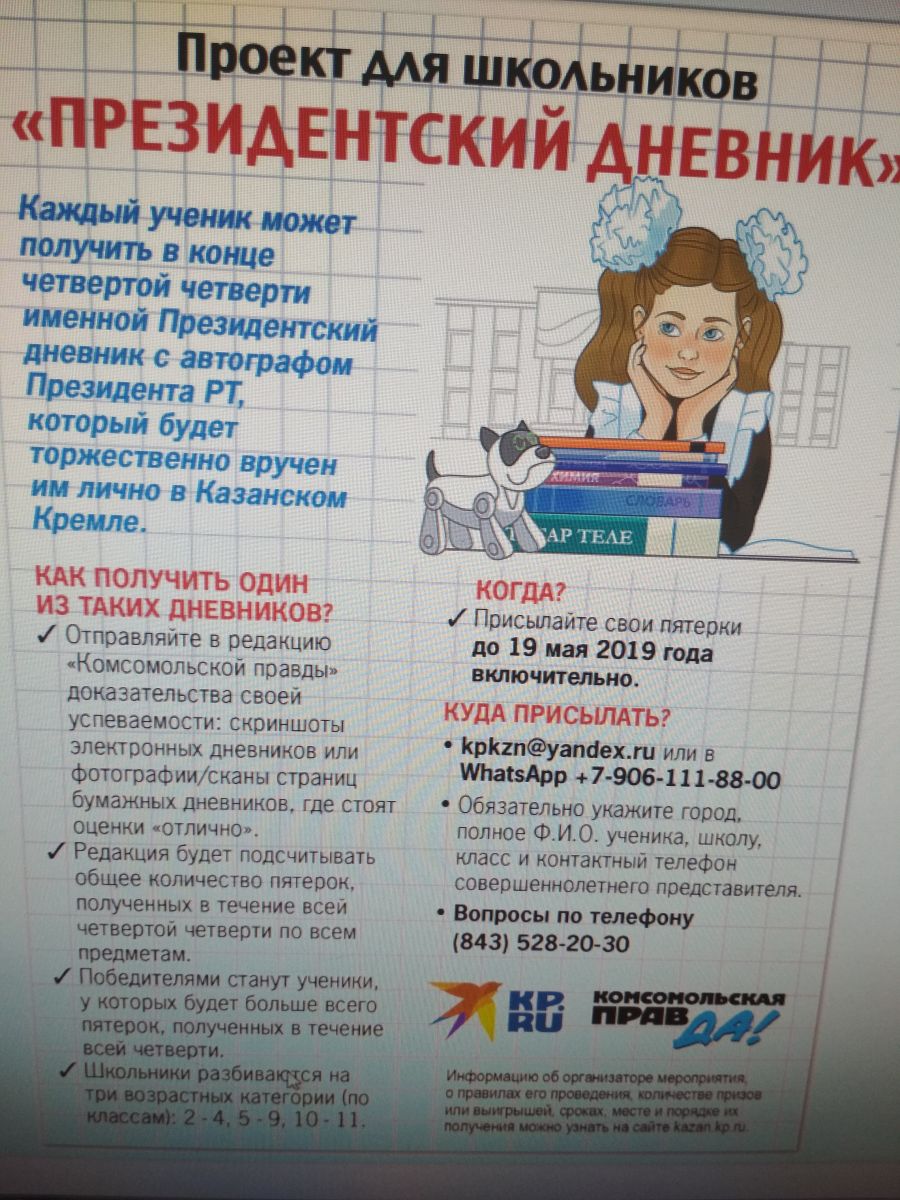 Опубликовано: 15.04.2019Среди школьников Республики Татарстан Министерством образования и науки Республики Татарстан совместно с представительством газеты «Комсомольская правда» в Республике Татарстан объявлен проект «Президентский дневник». Проект представляет собой масштабный республиканский конкурс на самую высокую успеваемость за право получить лично из рук Президента именной «Президентский дневник» с автографом для школьника и диплом от министра образования и науки Республики Татарстан для классного руководителя. Далее