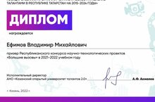 Поздравляем Ефимова В., ученика 11 класса, призера Республиканского конкурса научно-технических проектов "Большие вызовы" на базе Казанского открытого университета талантов. Желаем дальнейших успехов!