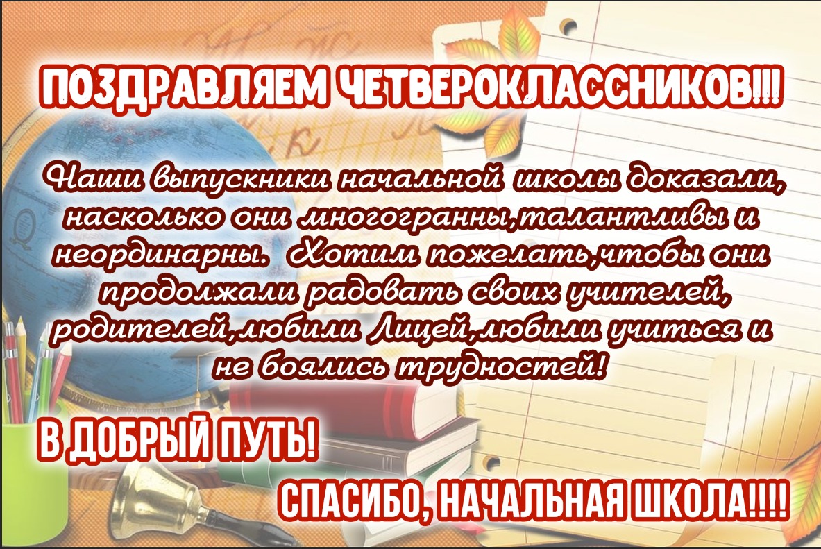 Всех учащихся лицея, педагогов и родителей поздравляем с началом нового учебного года! Поздравляем с Днём знаний, с новым стартом к большим победам, высоким достижениям. Желаем успехов в учебном процессе, в творческих поисках, в реализации идей, в стремлениях к мечтам. Пусть будни будут яркими и плодотворными, а выходные — увлекательными и весёлыми. Мы вместе!!!