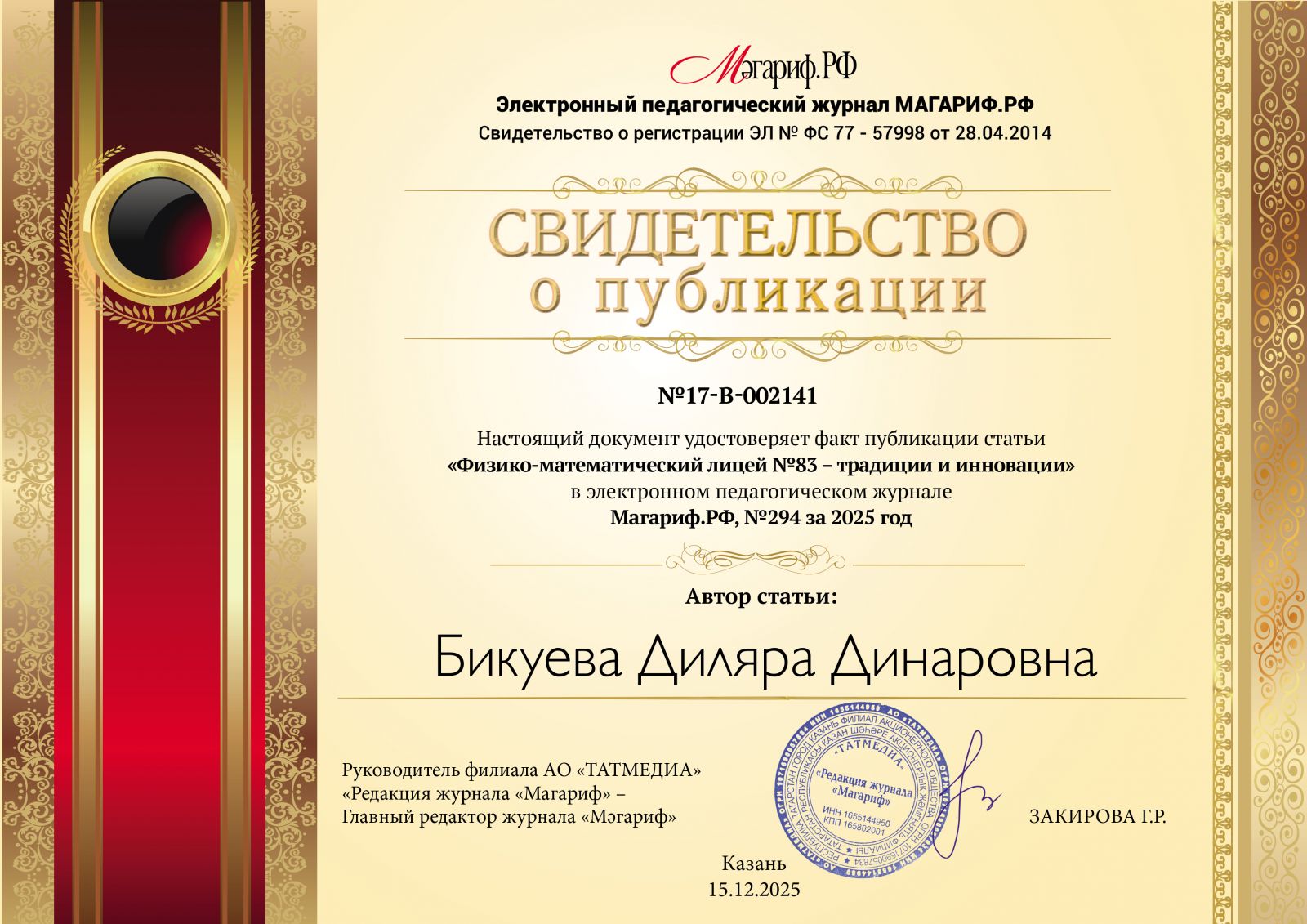 - Бикуева Д.Д., Шабурова А.А. "Физико-математический лицей №83- традиции и инновации