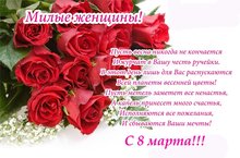 Милые женщины! Поздравляем вас с 8 Марта! Этот красивый праздник в начале весны приходит к нам, когда всё оживает, расцветает и распускается. Пусть в вашей жизни будет вечная весна, пусть ярко светит солнце, пусть поют птицы, пусть дни будут светлыми и безоблачными. Улыбок, хорошего настроения, радости, счастья!