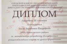 Преподаватель нашей школы по классу фортепиано - ЭЛЬЗА ЗАРАБОВНА ЕВГРАФОВА, стала ЛАУРЕАТОМ III СТЕПЕНИ в Городском конкурсе педагогических идей преподавателей фортепианных отделов ДМШ и ДШИ системы образования города Казани - за методическую разработку "Импровизация учащихся младших классов на уроках фортепиано". ПОЗДРАВЛЯЕМ!