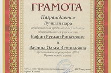 Преподаватели хореографии ДШИ Приволжского района - ВАФИН РУСЛАН РИНАТОВИЧ и ВАФИНА ОЛЬГА ЛЕОНИДОВНА признаны ЛУЧШЕЙ ПАРОЙ городского бала среди молодых педагогов образовательных учреждений и награждены ГРАМОТОЙ от Управления образования г.Казани. ПОЗДРАВЛЯЕМ!
