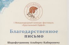 Дирекция компании "New Art Project" выражает благодарность нашему преподавателю - Шарафутдинову Альберту Кабировичу за сотрудничество и участие в качестве жюри в I Международном конкурсе-фестивале "Хрустальный Орфей", который проходил в городе Кирове 15-16 января 2016 года.