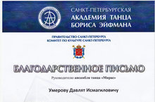 Руководителю ансабля танца "Мирас"- Давляту Исмагиловичу Умерову Санкт-Петербургская Академия Бориса Эйфмана, выражает глубокую признательность за высокий уровень подготовки детей к поступлению в профессиональное учебное заведение.
