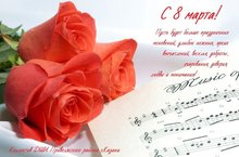 С 8 Марта, Дорогие женщины! Пусть прекрасные цветы и весеннее тепло вам поднимут настроение. Пусть весна в душе цветет и помогает во всех начинаниях. Желаем счастья, здоровья, достатка, добра и душевного тепла!