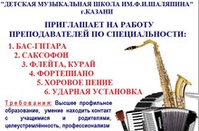 Муниципальное бюджетное учреждение дополнительного образования "ДЕТСКАЯ МУЗЫКАЛЬНАЯ ШКОЛА им.Ф.И.ШАЛЯПИНА" г.Казани приглашает на работу преподавателей по специальностям: Бас-гитара, Саксофон, Флейта, Курай, Фортепиано, Хоровое пение, Ударная установка. Информация по телефону: 8939311171 - Сиразиев Раиль Рифхатович 24.08.2023
