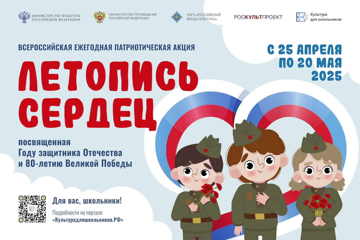 - С 25 апреля по 20 мая 2025 года в рамках межведомственного культурно-образовательного проекта «Культура для школьников» пройдет ежегодная всероссийская патриотическая акция «Летопись сердец», посвященная Году защитника Отечества и 80-летию Великой Победы.