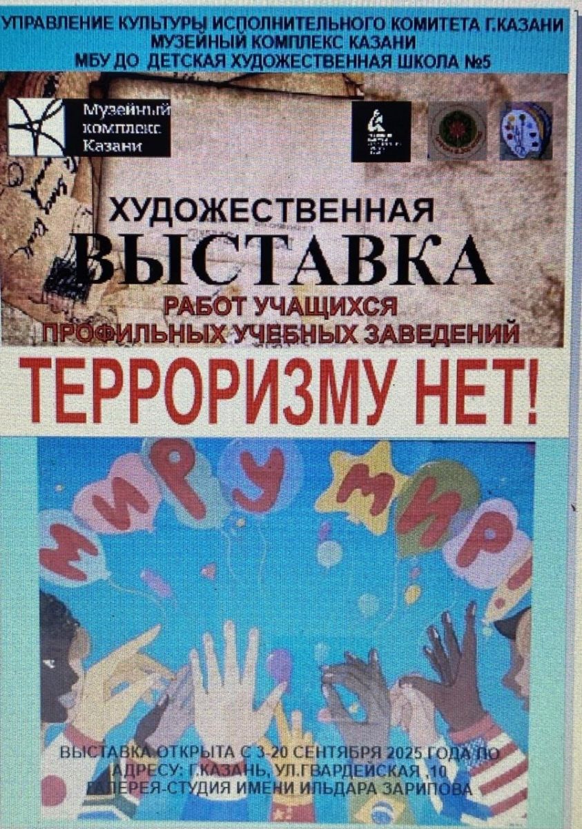 Опубликовано: 02.10.2025В галерее имени Ильдара Зарипова по адресу г. Казань, ул. Гвардейская , 10 проходила выставка работ с 3 по 20 сентября учащихся профильных учебных заведений "Терроризму нет!" 3 сентября день солидарности в борьбе с терроризмом. Этот день посвящён почтению памяти жертв террористических актов и выражению единства общества и государства перед лицом террористической угрозы.