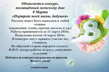 Объявляется конкурс, посвящённый женскому дню 8 Марта «Портрет моей мамы, бабушки» Рисунок может быть выполнен в любой технике (карандаши, гуашь, краски, пастель и д.р.) Работы принимаются до 11 марта (включительно) 2016г. Подведение итогов до 14 марта 2016г. В конкурсе могут принять участие все учащиеся. На обратной стороне портрета указать: Ф.И.О. автора работы, возраст, спортивное отделение Победители конкурса награждаются призами. Желаем удачи! 24.02.2016