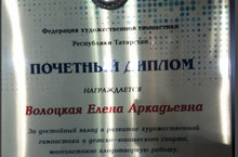 Директору нашей школы Волоцкой Елене Аркадьевне, от Федерации художественной гимнастики Республики Татарстан, вручен почетный диплом за достойный вклад в развитие художественной гимнастики и детско-юношеского спорта, многолетнюю, плодотворную работу, высокое профессиональное руководство и в связи с 55-летним юбилеем и присвоением звания Заслуженный работник Республики Татарстан.