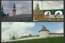 Учащиеся и сотрудники нашей школы приняли активное участие во флешмобе «Обними Кремль». Более двух тысяч человек, растянувшись на пару с лишним километров, взялись за руки, таким образом образовав кольцо. С территории Кремля в небо взвился российский триколор . В акции приняли участие и туристы, приехавшие на Чемпионат мира по водным видам спорта. Затем нас всех угощали национальным татарским лакомством чак-чак. Блюдо весом в поторы тонны, с элементами национального орнамента было выполнено в виде Спасской башни Казанского кремля.