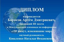 Поздравляем Башенова Глеба Александровича и Борисова Артёма Дмитриевича - призёров третьей степени Международной олимпиады по информатике «108 минут, изменившие мир».