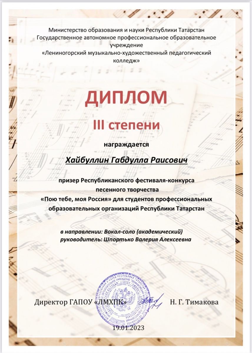 Поздравляем Хайбуллина Габдуллу, студента группы ТОД 2111 с дипломом 3й степени в Республиканском фестивале-конкурсе песенного творчества «Пою тебе, моя Россия»