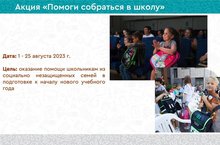 Цель: оказание помощи школьникам из социально незащищенных семей в подготовке к началу нового учебного года. -