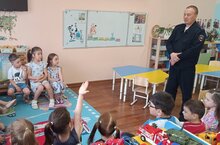 4 июня к нам в детский сад с профилактическим визитом пришел Гостев Михаил Сергеевич — старший инспектор отделения пропаганды БДД ОГИБДД УМВД России по городу Казани. На встрече он провел беседу с детьми на тему безопасного поведения на дороге. Ребята узнали о правилах дорожного движения, которые помогут им быть внимательными и осторожными на улице. Особое внимание инспектор уделил таким важным аспектам, как езда на велосипеде и самокате и использование детского кресла в автомобиле.