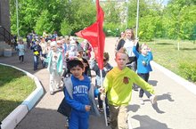 Закончился клубный час торжественным шествием вокруг детского сада со Знаменем Победы. -