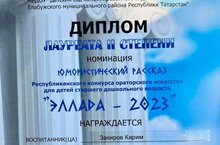 Поздравляем воспитанника подготовительной группы №6 Закирова Карима с дипломом лауреата 2 степени Республиканского конкурса ораторского искусства "Эллада - 2023" для детей старшего дошкольного возраста, посещающих логопедическую группу. Конкурс проходил в очном формате в г. Елабуга. Карим читал произведение Н.Носова "Живая шляпа" ( педагог -учитель-логопед Л.В. Пашкеева).