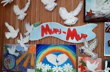 "Миру-мир!" - выставка рисунков под таким названием развернулась в холле детского сада в предверии праздников 1 мая и День Победы. Ключевой фигурой выставки стал Голубь как символ мира и согласия. Голубь на рисунках, голубь-оригами, голубь, выполненный в технике аппликации... Каких только голубей нет на нашей выставке. Голуби на стене...Голуби , парящие под потолком...