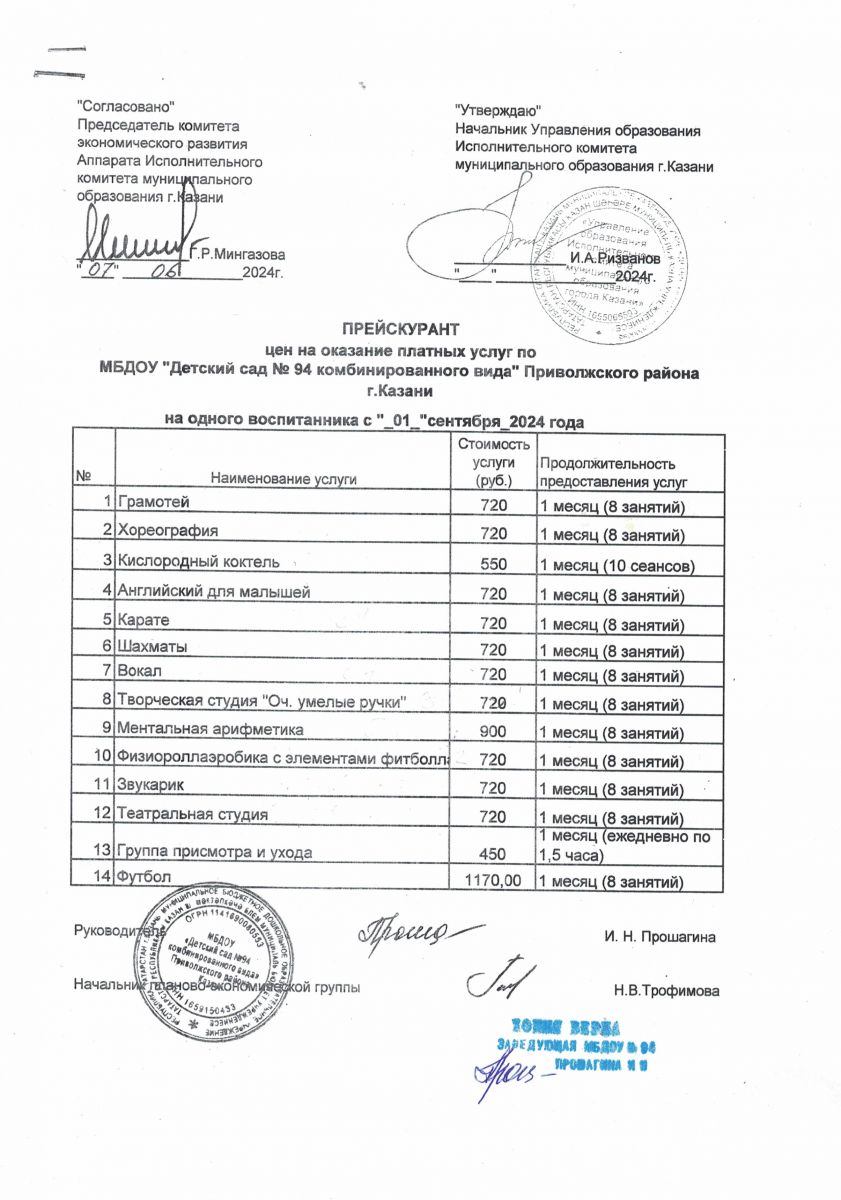 Прейскурант на оказание платных услуг 2024-2025 уч.год