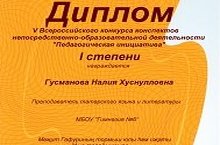 В октябре 2016 года учитель татарского языка и литературы нашей гимназии Гусманова Налия Хуснулловна участвовала во Всероссийском конкурсе конспектов непосредственно-образовательной деятельности "Педагогическая инициатива" и была награждена Дипломом I степени в номинации "Конспект урока татарской литературы". Поздравляем!!!