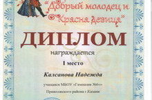26.11.14. в Молодежном центре «Ак Барс» ученица 11а класса Калсанова Надежда достойно представила нашу гимназию в финале городского конкурса «Добрый молодец и красна девица». Выражаем восхищение и слова искренней благодарности самой Наде и всем, кто своим талантом и опытом помогал ей идти к успеху в этом конкурсе. Мы бесконечно признательны также всем тем, кто смог поддержать Надежду своим голосом во время интернетголосования. Огромное всем спасибо!