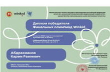 Поздравляем Абдрахманова Карима, ученика 5 класса ( учитель - Чинилкина Е.П.), ставшего победителем финальных олимпиад Winkid по русскому языку.