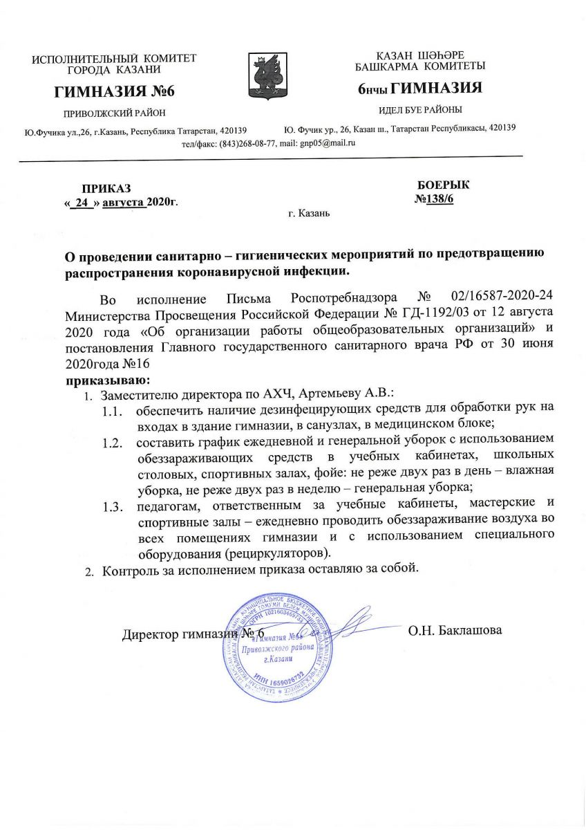 Приказ № 138-3 от 24.08.2020 г. Об утверждении режима в 1 полугодии 2020-2021 учебного года в условиях новой коронавирусной инфекции