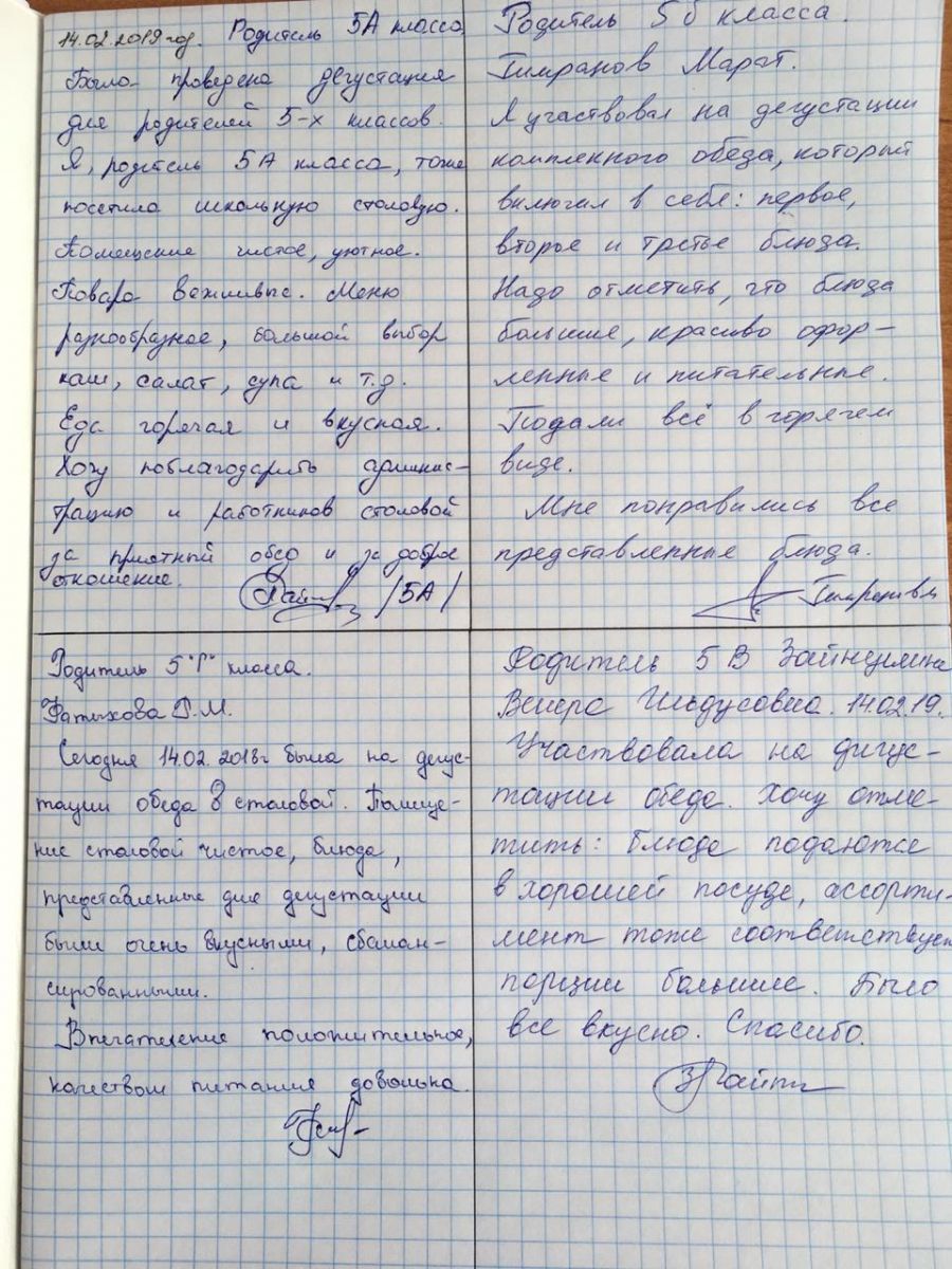 Опубликовано: 14.02.2019классных руководителей (Шарафутдинова Э.А., Исхакова Г.Р., Лотфуллина Г.Ф., Шарипова Л.Х.). Родителям понравилось качество блюд, эстетический вид и вежливое обслуживание в столовой нашей гимназии.