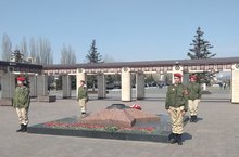 Отряд юнармейцев нес Почетный караул у Вечного огня в парке Победы.